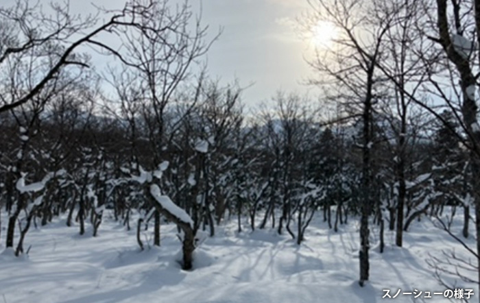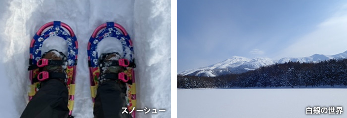 さらっさらのパウダースノーも、スノーシューを履いているとスイスイ。スノーシュは想像よりもとても軽くてコツも特にいらず、夏は入ることのできない森の中や湖の上をどんどん進みます。