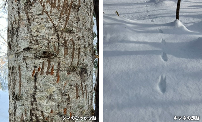 森の中には熊が引っ搔いた跡や、キツネの足跡が。