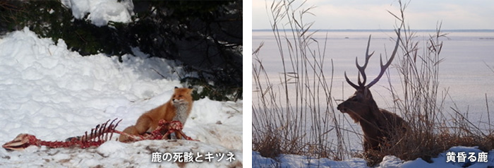 鹿の亡骸の横にいるキツネと黄昏の鹿。